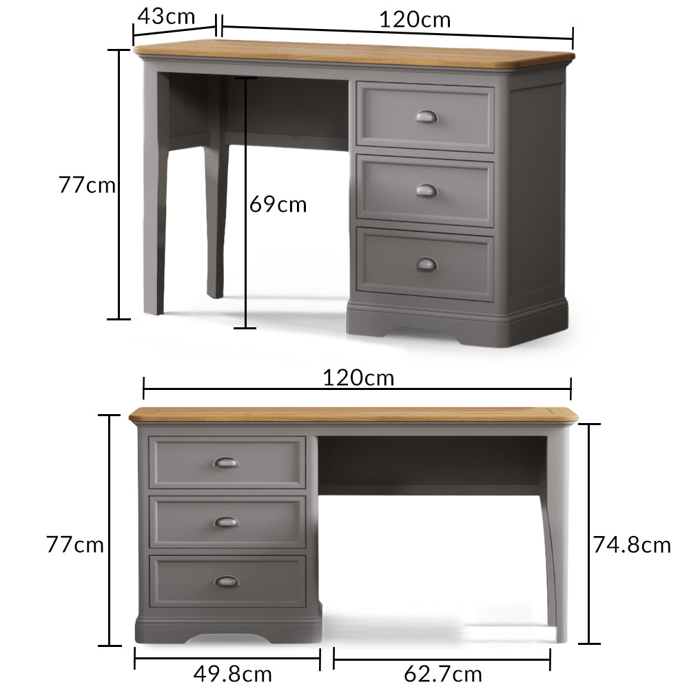 With stunning classic design details, the Ashton Dressing Table features a durable solid hardwood frame with a smooth light grey painted finish, topped with 100% solid oak.
