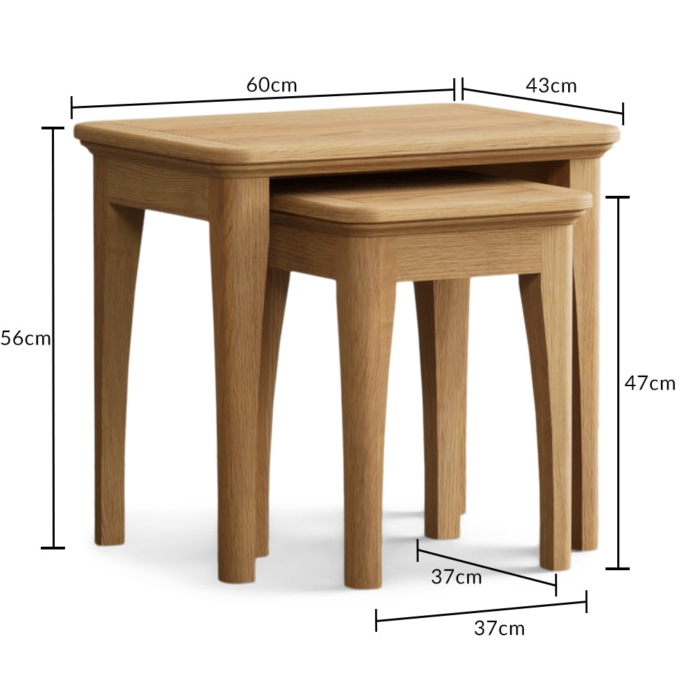 With stunning classic design details, the Ashton Nest of Tables is a set of two tables with durable solid hardwood legs with a smooth cream painted finish, topped with 100% solid oak.