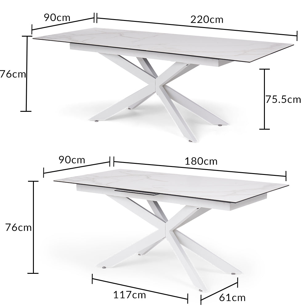 The Boston 180cm Extending White Ceramic Dining Table brings unique style and practicality to your dining area. Perfect for the modern home, the extending dining table features a smooth glass table top with a white ceramic finish and white metal legs in an eye-catching cross design.