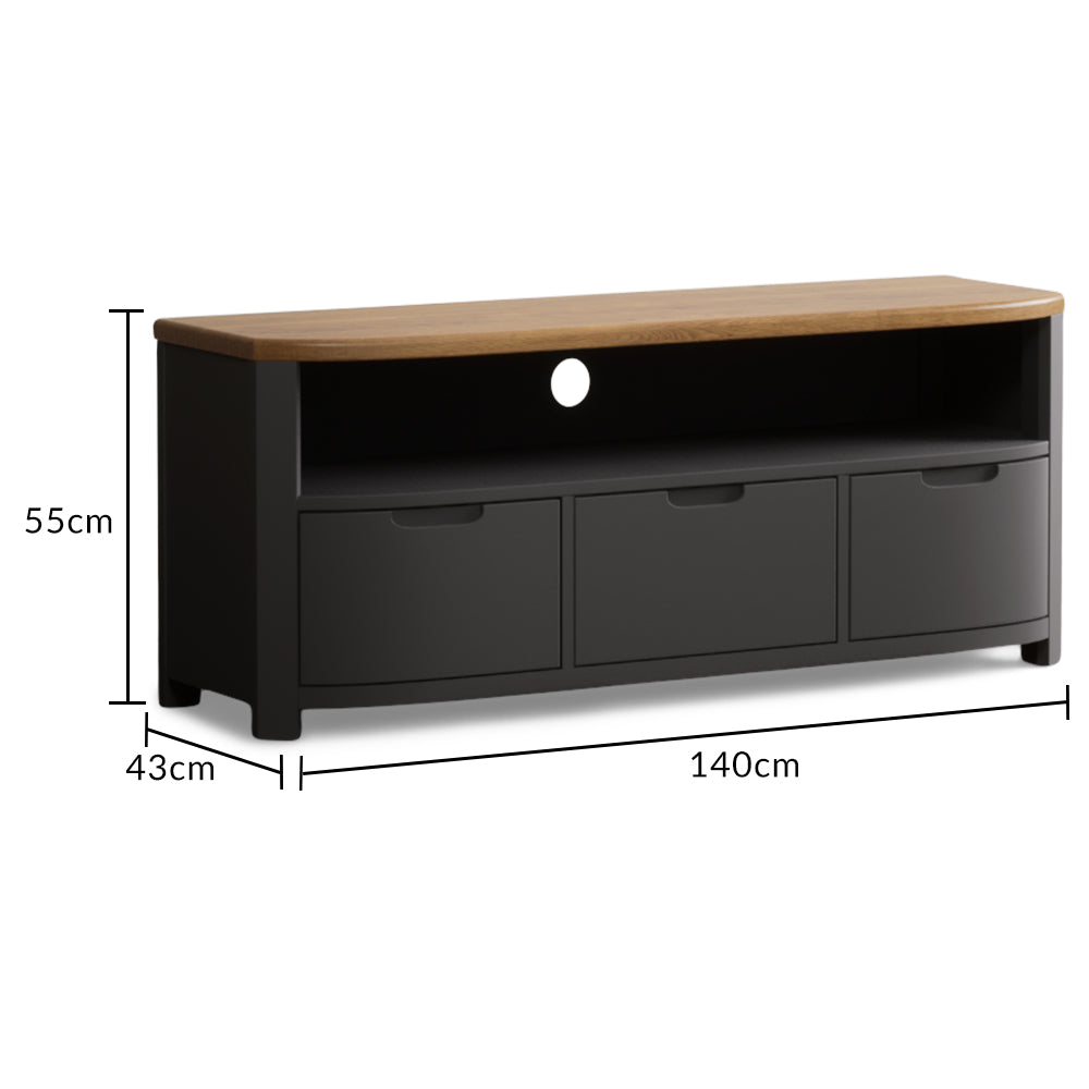 Beautifully modern, the Brahms TV Unit features a sturdy solid hardwood frame with a smooth grey painted finish, topped with 100% solid oak.