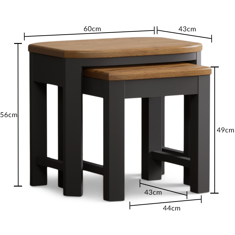 Beautifully modern, the Brahms Nest of Tables is a set of two versatile tables with sturdy solid hardwood frames with a smooth grey painted finish, topped with 100% solid oak.