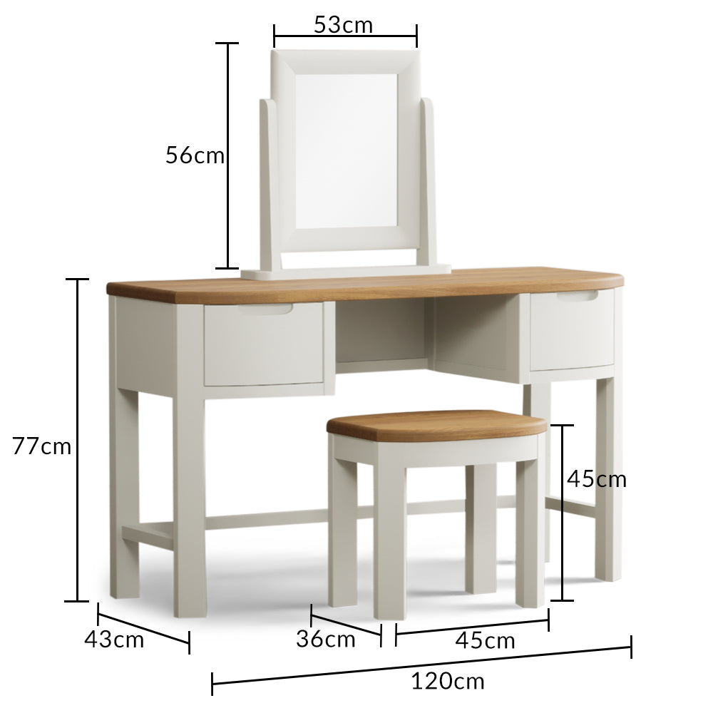 Beautifully modern, every item in the Brahms Dressing Table set features a sturdy solid hardwood frame with a smooth white painted finish, with 100% solid oak topping the dressing table and stool.