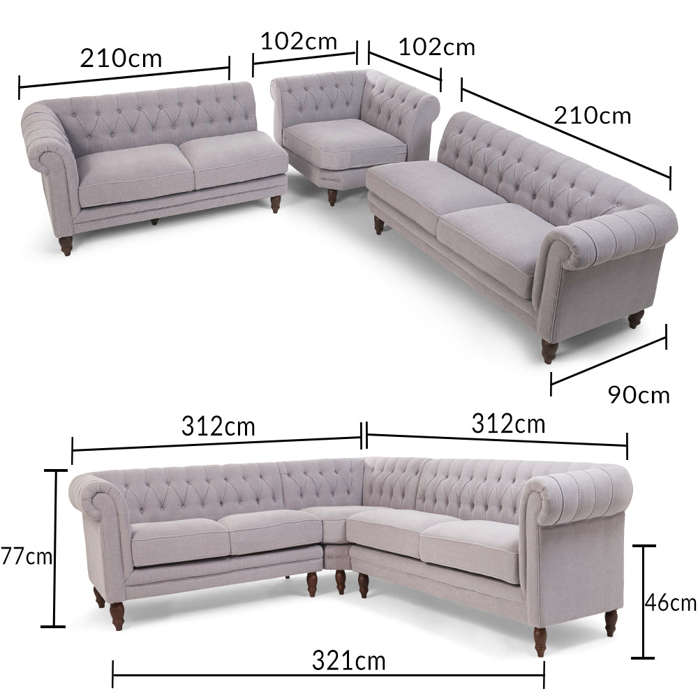 The Cavendish Medium Grey Linen Corner Sofa features a classic design to complement any home. With smooth linen in a suit-all grey shade, the corner sofa features deep buttoning on the backrest and elegant scrolled armrests and is complete with ornate dark wood feet.