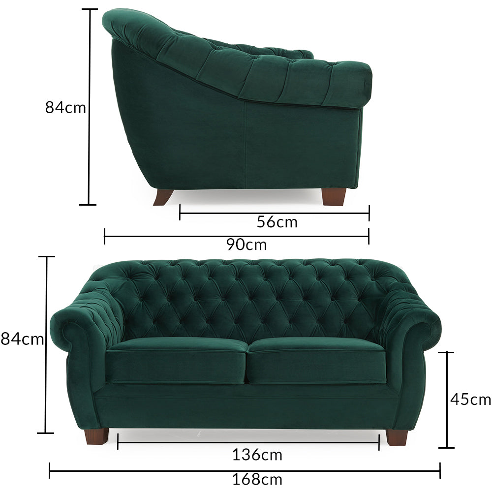 The Eva Chesterfield Green Velvet Two-Seater Sofa. Featuring deep-buttoning, rolled arms and extra-padded cushions for ultimate comfort.