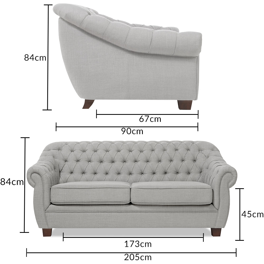 With its Chesterfield-inspired details and generously padded body, the Eva Chesterfield Grey Linen Fabric 3 Seater Sofa offers modern-day comfort combined with timeless style. Able to seat three people, this sofa boasts classic features such as a deep-buttoned back, scroll arms and small but sturdy solid ash legs. Its chic grey linen upholstery ensures that this stylish sofa will fit well with numerous interior colour schemes – and the two matching free cushions make for a fully thought-out and well accessorised look. S-sprung seats create a firm and supportive sit.