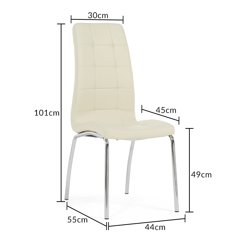 Fabrice Cream Chairs are chic, stylish and distinctly different. Upholstered in cream faux leather with a tufted design and featuring sleek chrome legs.