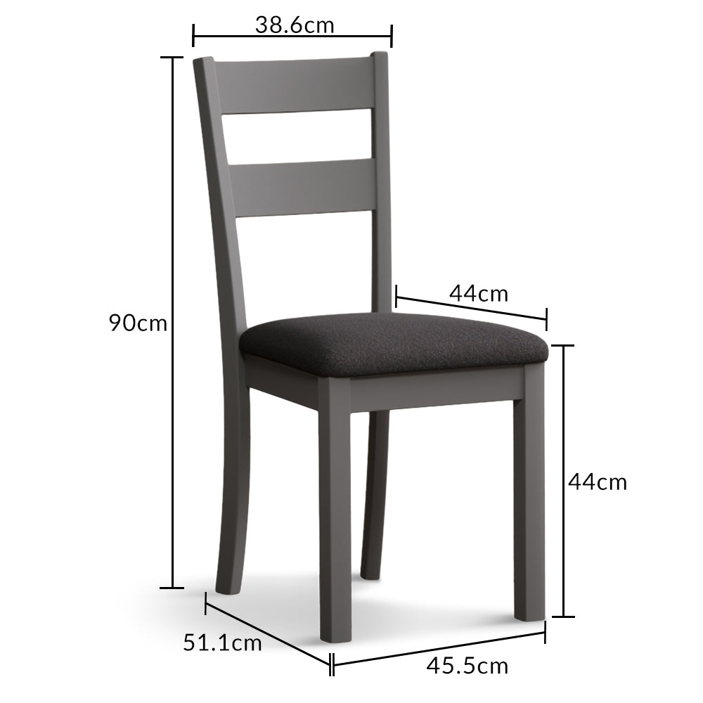 The Faversham Light Grey Painted Chair with Charcoal Grey Fabric Seat Pad is a sturdy, stylish dining chair with a classic laddered-back design. Crafted from durable solid hardwood, the Faversham chair features a smooth light grey-painted finish and is complete with a comfortable charcoal grey fabric seat pad. Match the chair with your grey-painted or natural solid oak dining table.