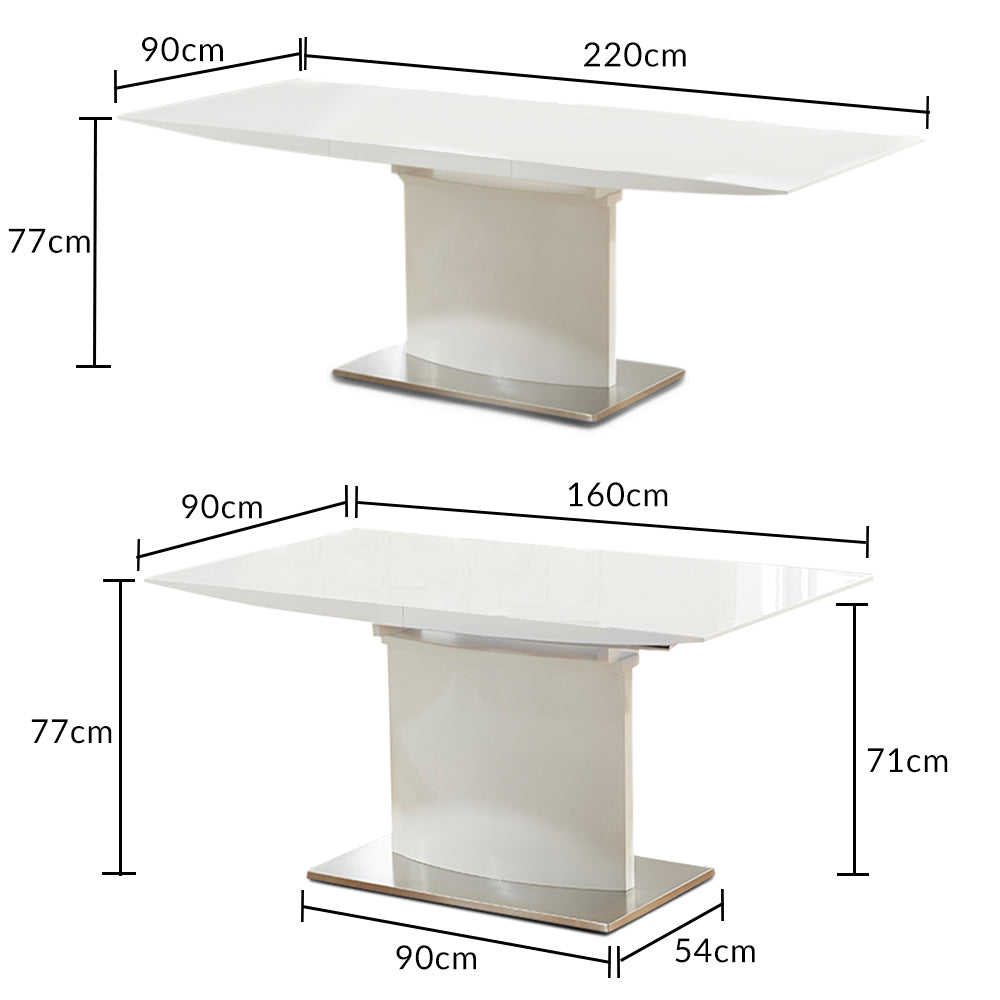 The Extending Hailey 160cm White High Gloss Dining Table - the sleek surface and concave pedestal of the Hailey table adds sophistication to any dining area. The table extends via an inbuilt feature to suit every occasion.