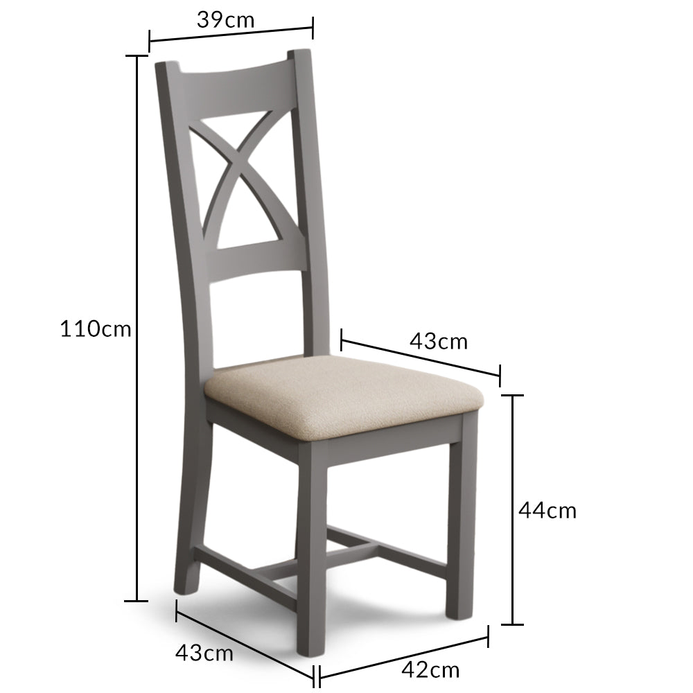 The Painted Light Grey X Back Dining Chairs are a stunning addition to your oak dining table. Crafted from 100% solid hardwood, the chairs feature a light grey painted finish and classic cross design on the backrest.