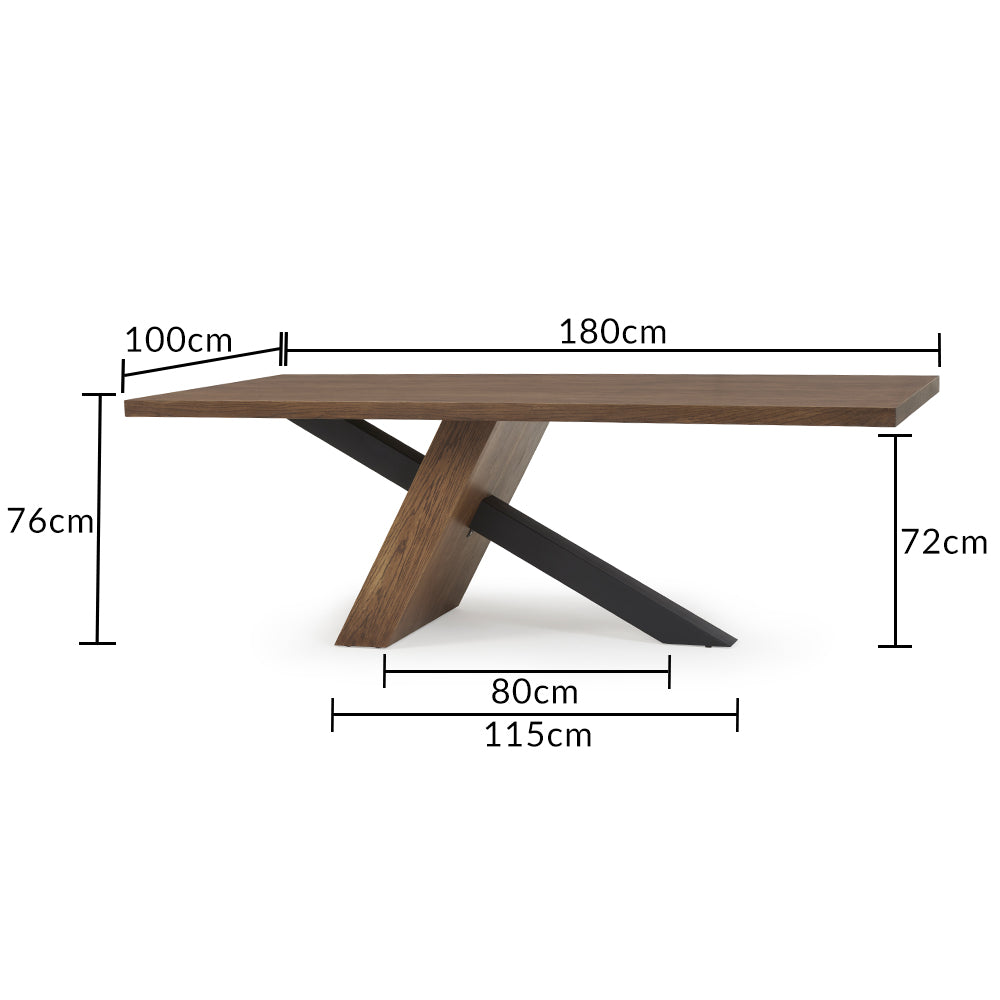 The striking Maison table features a modern design, with a sturdy solid hardwood leg crossing with a sleek metal support beneath a thick rustic oak tabletop.