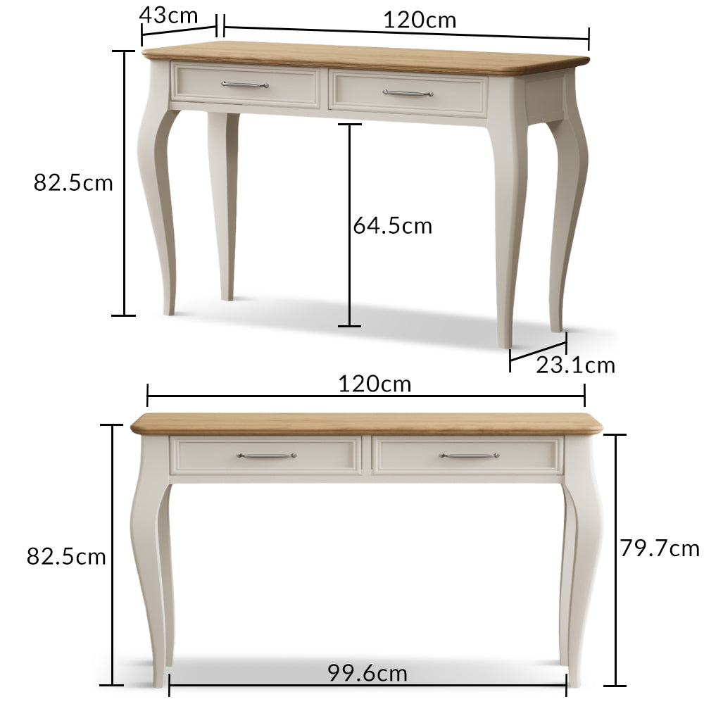 The Maison Oak and Soft White Painted Dressing Table is a stylish and functional addition to any bedroom. Its elegantly curved legs add a touch of sophistication, while the sturdy soft white painted solid hardwood frame and natural 100% solid oak top ensure durability and a timeless look. This dressing table is not only beautiful but also practical, featuring two dovetail drawers that offer convenient storage for your makeup, accessories, or other essentials.