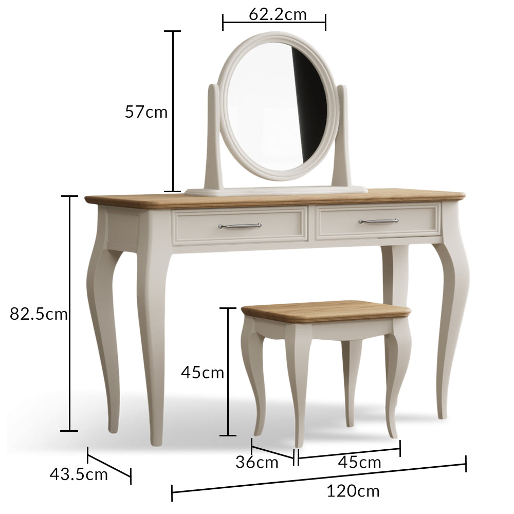 The Maison Oak and Soft White Painted Dressing Table Set is a perfect blend of style and functionality, designed to enhance your daily beauty routine. This set includes a beautifully crafted dressing table, a comfortable stool, and an elegant mirror, providing a complete solution for your grooming needs.