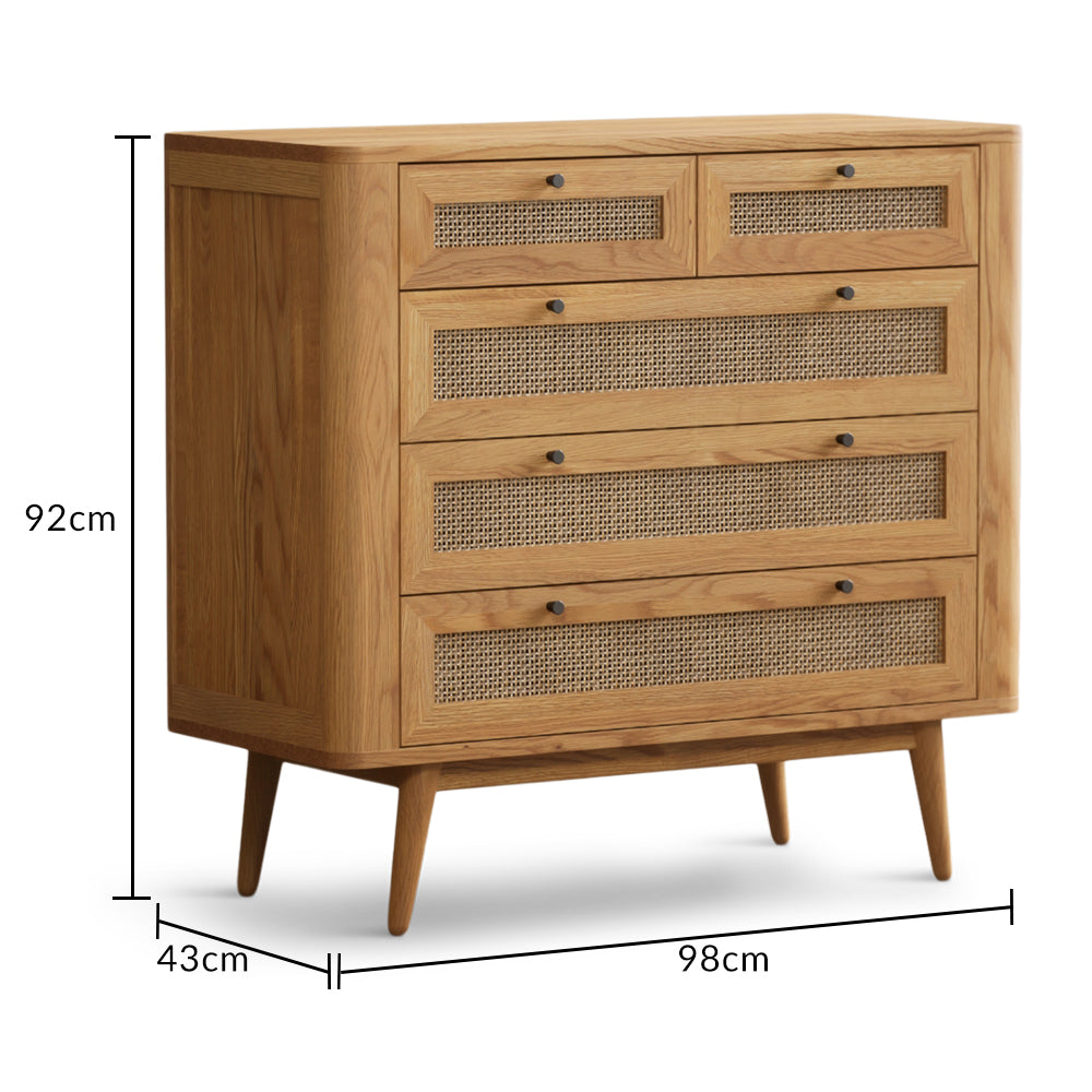 • Features five drawers with a distinctive mesh design, including three large drawers for ample storage and two smaller ones for additional organisation.