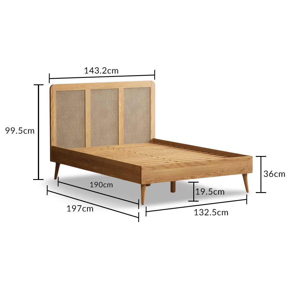 • Features a stylish rattan headboard that adds texture and visual interest, complementing the natural oak frame.