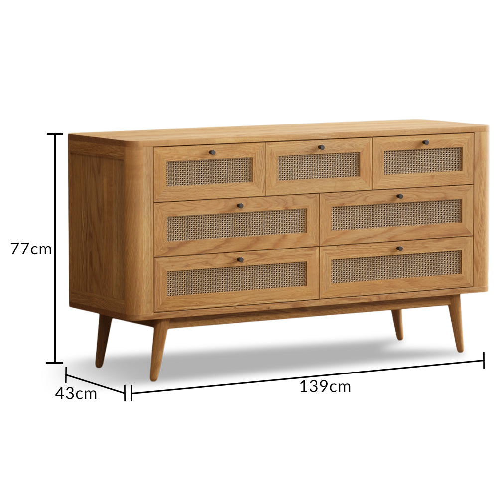 • The rattan detailing on the drawers adds a textured, natural touch, complementing the oak finish.