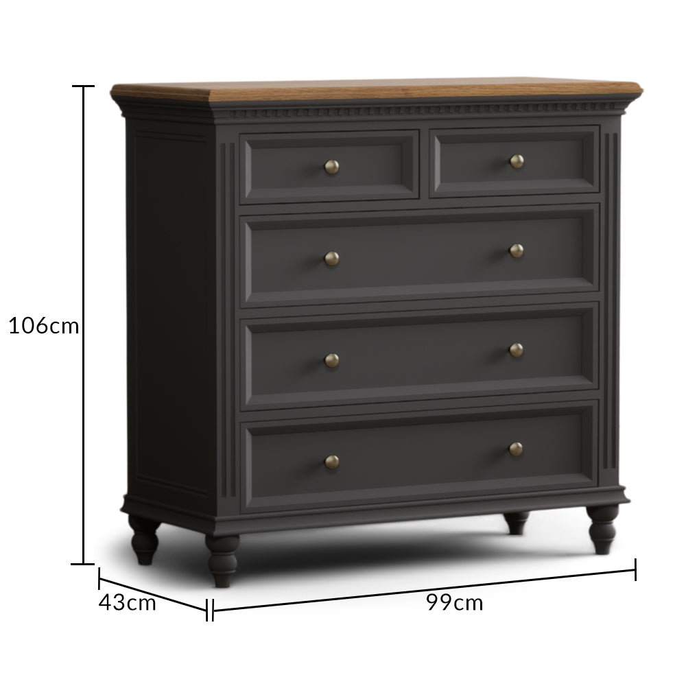 The Philippe Oak and Charcoal Grey Painted 2 Over 3 Chest of Drawers is a stylish storage solution that will stand out in your bedroom. Offering five dovetail drawers, there is plenty of space inside for all your bedroom essentials. With a solid hardwood frame and oak top, this is a long-lasting and stylish piece of furniture.