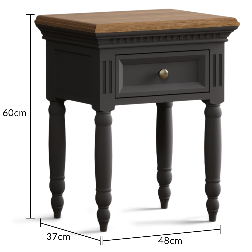 The Philippe Oak and Charcoal Grey Painted Bedside Table will make a charming addition to your bedroom. The durable bedside table features a hardwood frame and 100% solid oak top. With one dovetail drawer offering storage, this is a useful and sturdy item for any bedroom.