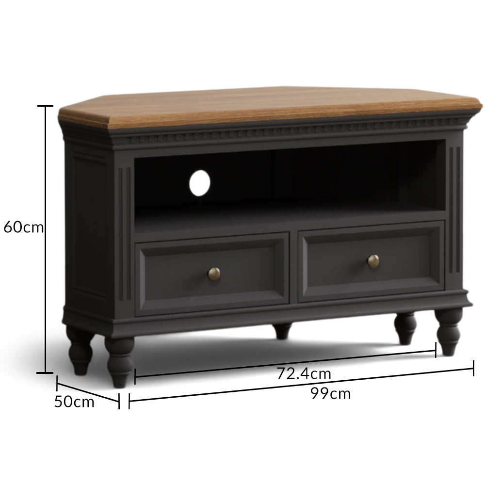 The Philippe Oak and Charcoal Grey Painted Corner TV Cabinet will look stylish in the corner of the living room and is a sturdy piece of furniture. With two drawers for storage, the corner TV cabinet features a durable hardwood frame and solid oak top.