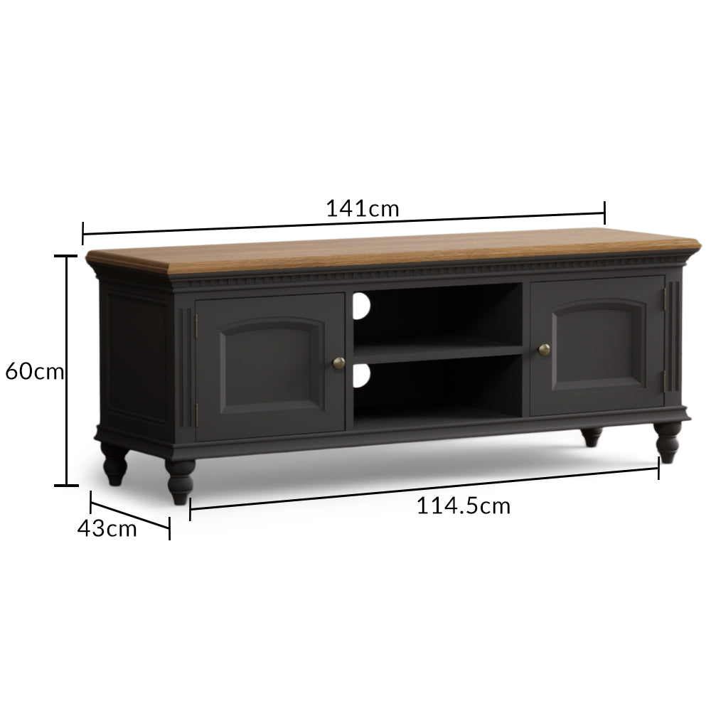 The Philippe Oak and Charcoal Grey Painted Large TV Cabinet is the perfect way to display your TV in your living room. A sturdy cabinet that is built to last, it features a handy central shelf and two side cupboards ensuring plenty of storage. With a 100% solid oak top, the grey-painted TV cabinet is a sturdy, stylish option for any living area.