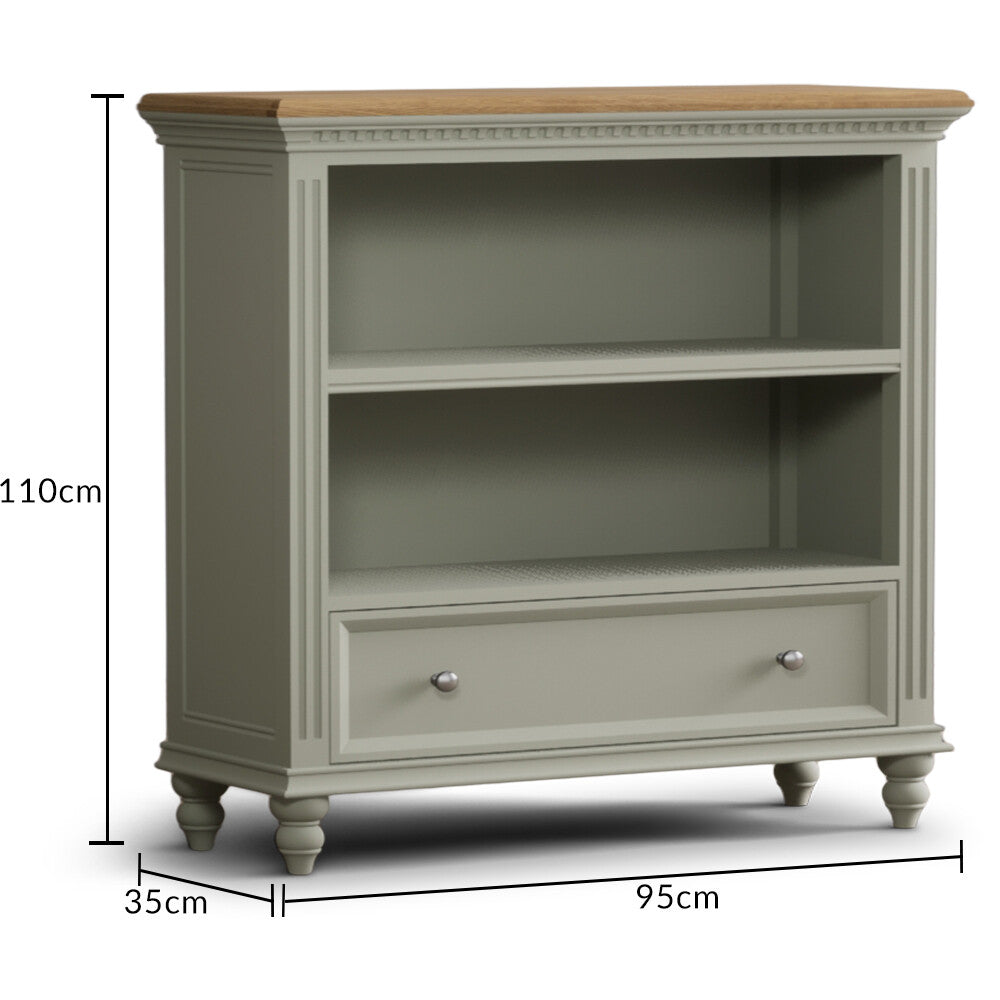 The Philippe Oak and Soft Green Painted Low Bookcase is a stylish and functional addition to any room, perfect for displaying books, decor, and other cherished items. Its charming design and practical features make it an excellent choice for various spaces in your home.