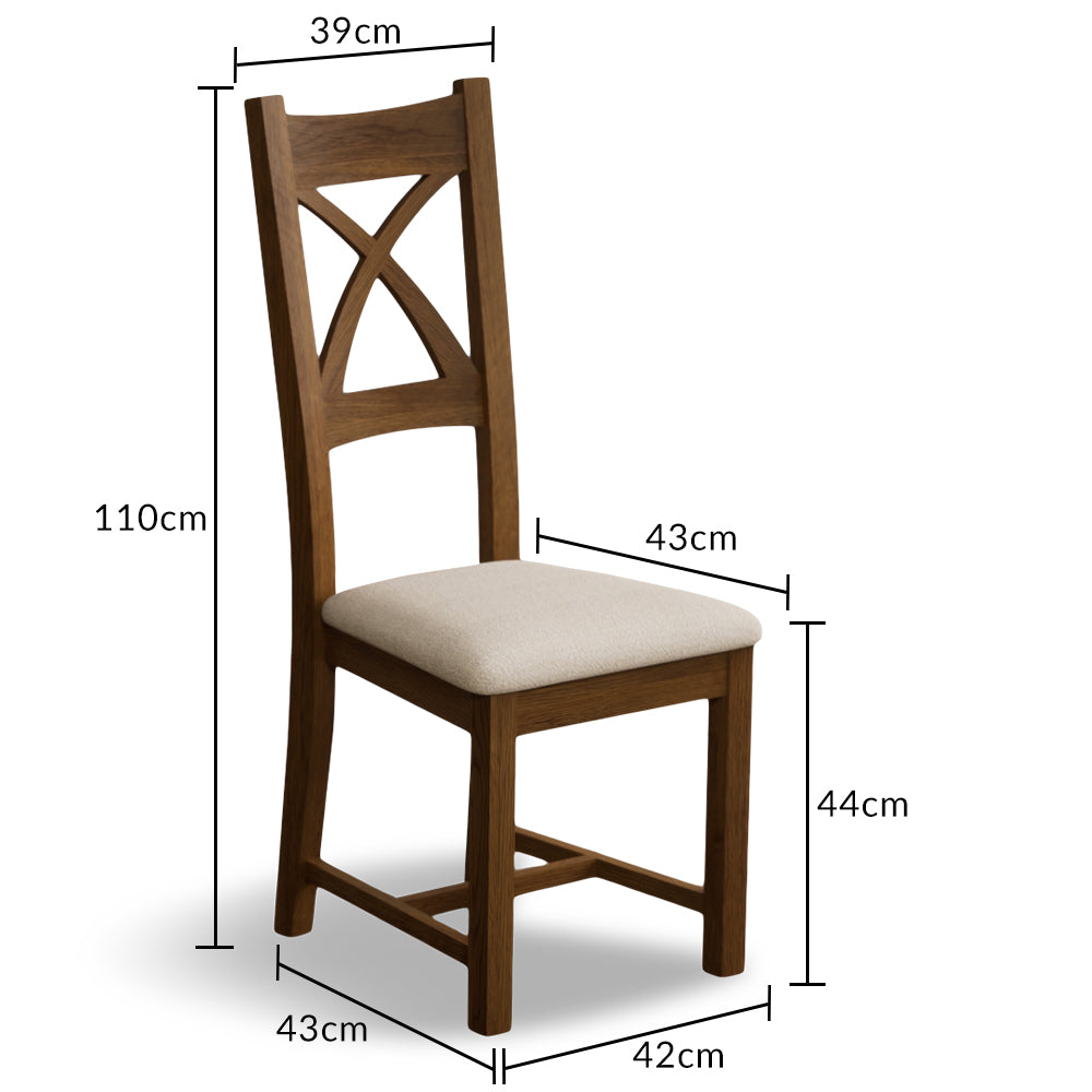 The Rustic Solid Oak X Back Dining Chairs are a stunning addition to your rustic dining table. Crafted from 100% solid oak, the chairs feature a classic cross design on the backrest and are complete with comfortable seat pads.