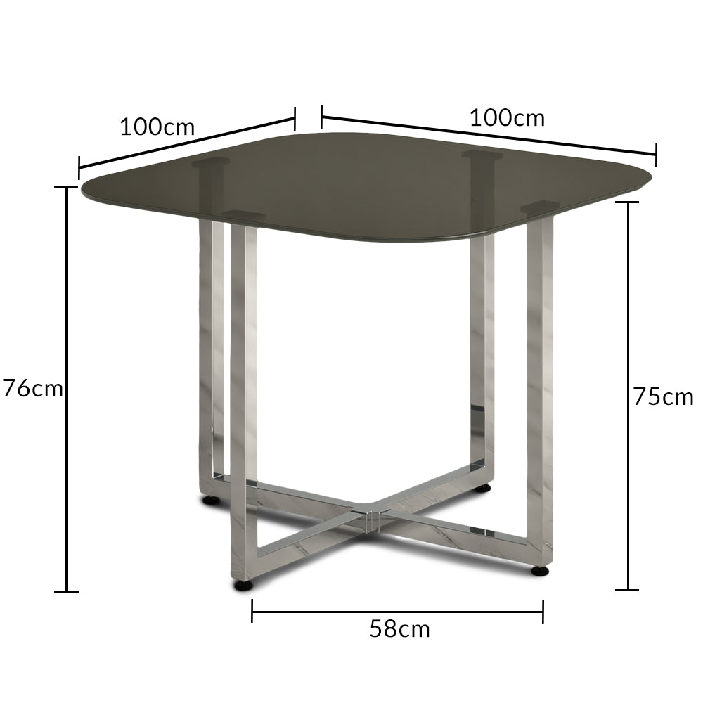 Turn heads with the modern and space-saving Santorini table. A grey glass surface with gently curved corners combines with a sleek chrome support that matches the comfy faux leather stools.