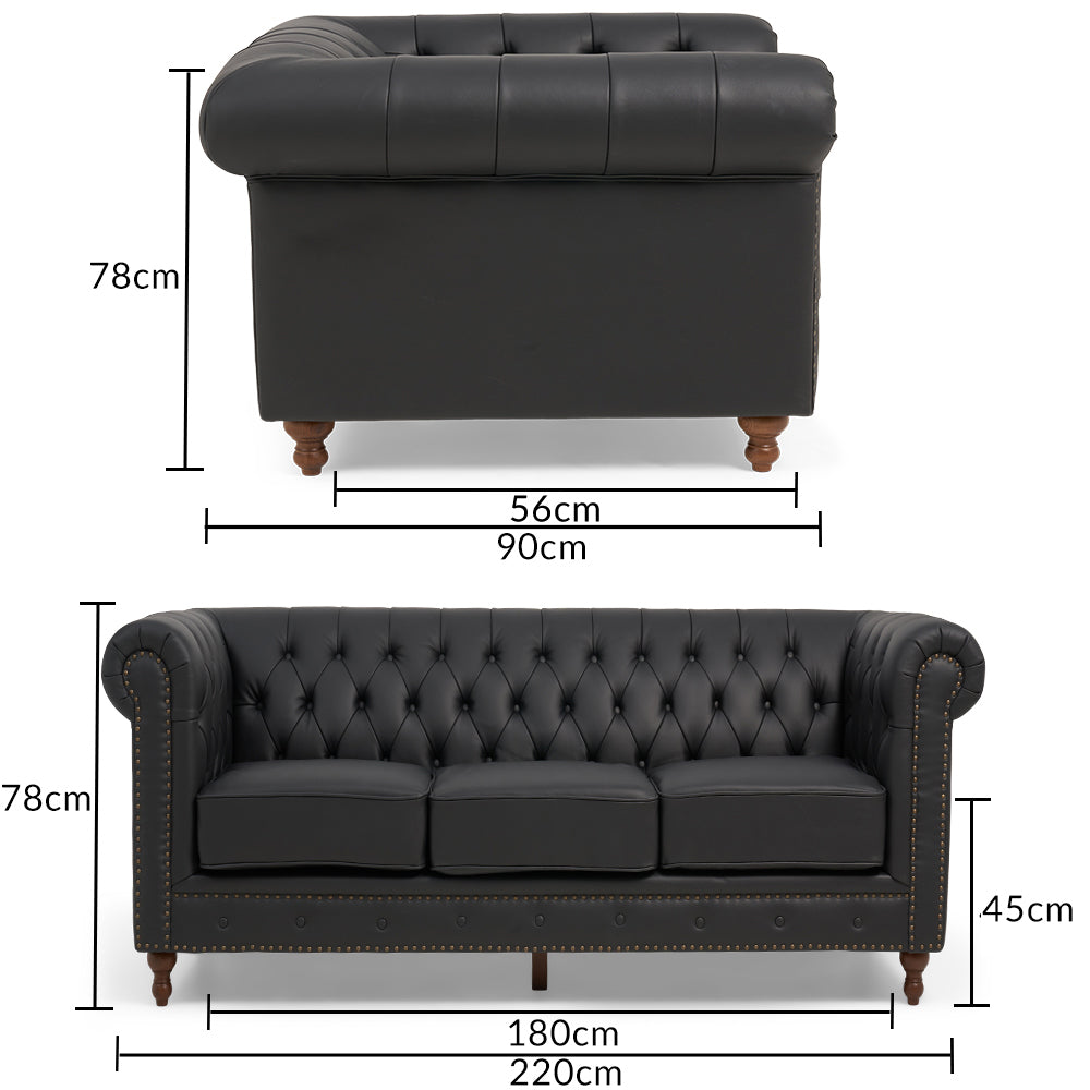 Upholstered in luxe black leather, the Wellington Chesterfield 3 Seater Sofa is classic and elegant. With comfortable deep filled seat cushions and timeless buttoned design, the Wellington is trimmed with chic metal studs. The 3 seater sofa is complete with ornate and sturdy solid wood legs.