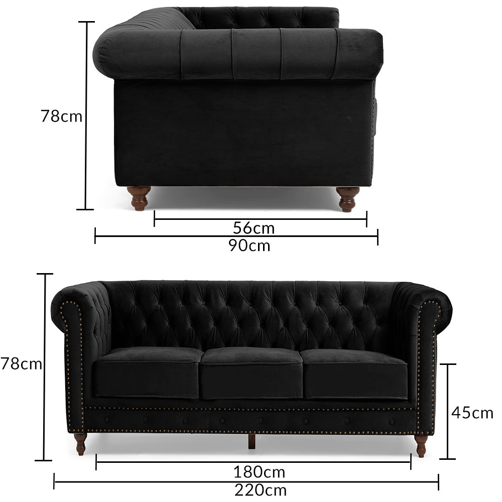 A stunning centrepiece for your living room, the Wellington Chesterfield Black Velvet 3 Seater Sofa is spacious and stylish. The large sofa features soft black velvet with elegant rolled armrests, deep buttoning and metal studs for a sophisticated finishing touch.