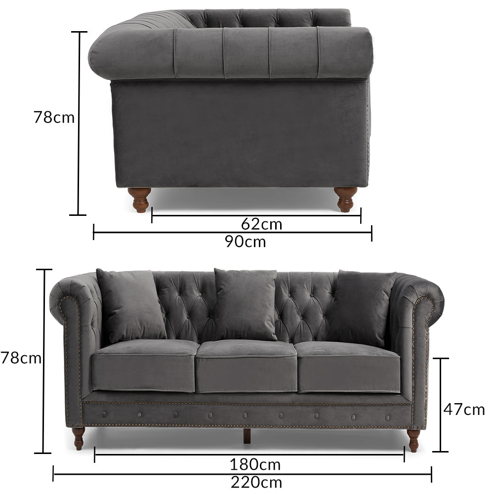 The Wellington Chesterfield Grey Velvet 3 Seater Sofa features a classic design to suit any home. With soft-touch grey velvet, the 3 seater sofa features deep buttoning and scrolled armrests and is finished with metal studs. Featuring comfortable foam seat cushions, the velvet sofa is complete with sturdy solid wood feet.